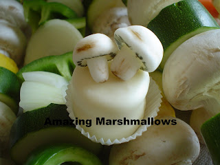 A 90 degree Sunday = deck, sun, relaxation and marshmallows. I have my vegetables washed, cut and skewered ready for tonight’s dinner. I molded the fondant into two adorable little sweet mushrooms. I used my black and brown colorants to help give them their texture and used my finest brush to paint the black gills on the underside of the cap.